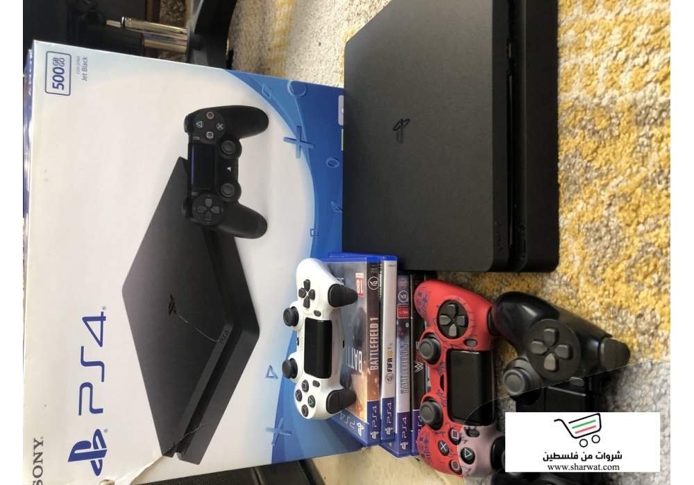بلاستيشن ٤ سلم شبه جديد مع كرتونة. خمس العاب + ثلاث ايدين +غطاء لليد +جميع الاسلاك موجودة + حجم الذاكرة ٥٠٠جيجا