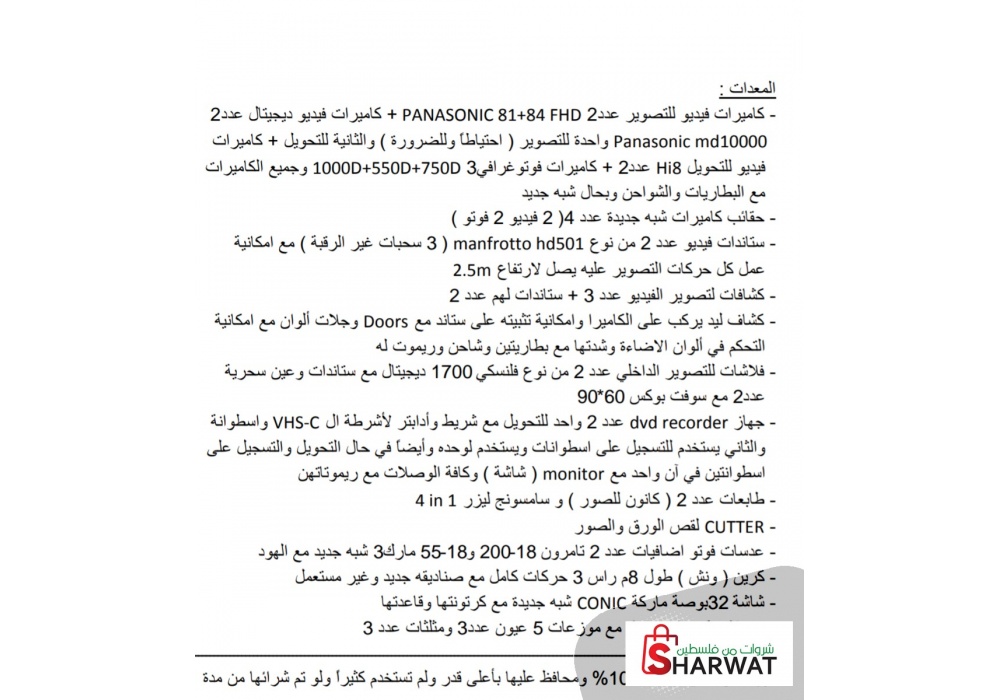 كاميرات فيديو وفوتو - طابعات - فلاشات - ألبومات - براويز - ماكنة جلاتين - قسم لتحويل الاشرطة - كاونترات - رفوف - كراسي قش..الخ