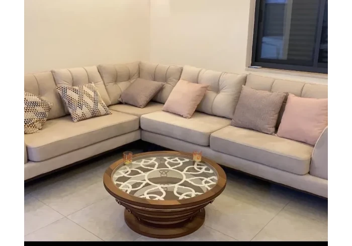 طقمً جلوس زاوية كنب وطاولةً وسط دائرية بحالة ممتازة
