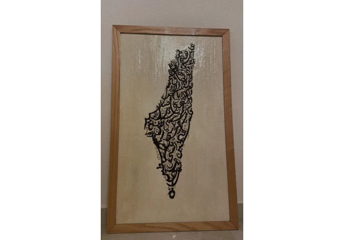 اللوحة عبارة عن خارطة فلسطين يتخللها ابيات من قصيدة الشاعر محمود درويش بالخط العربي ( على هذه الارض ما يستحق الحياة )