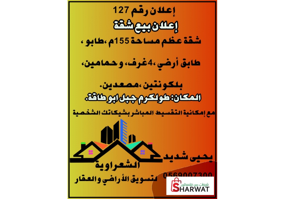 *شقة عظم مساحة 155م ،طابو ، طابق أرضي ،4غرف، وحمامين، بلكونتين ،مصعدين.