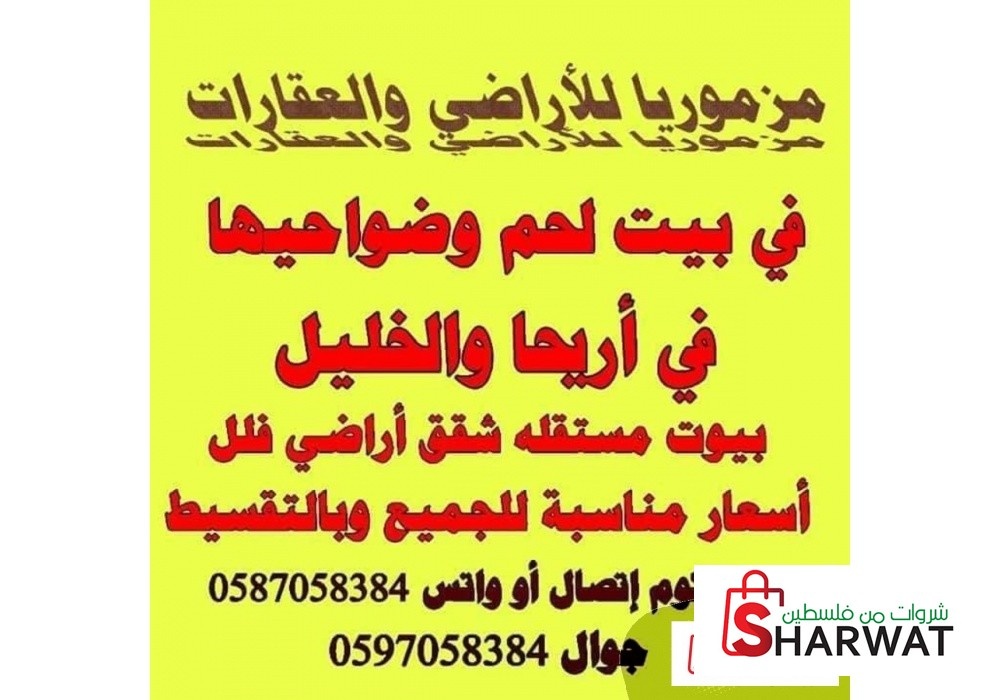 كما يتوفر شقه في الدوحه بالقرب من حاووز المي طابق 3 مساحتها 140 متر ب 500 الف شيكل دفعه اولى النصف والباقي تقسيط ويتوفر شقق و بيوت أخرى وقطع اراضي أخرى بمساحات مختلفه وشقق للبيع بالتقسيط وشقق للايجار لا تبعد عن مزموريا في حالة الانشغال التواصل على الواتس اب على الرقم الاول 0587058384 مزموريا للأراضي والعقارات الخيار الأفضل لكم اهلا وسهلا بالجميع الكثير من العروض الجديده بأسعار مناسبة و بالتقسيط بما يتناسب مع أصحاب الدخل المحدود
