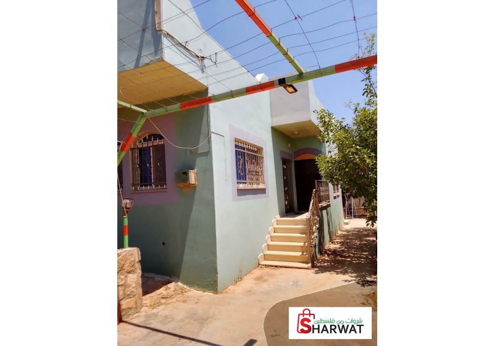 بيت محاط بسور وفيه حديقة واشجار مثمرة وواصلها شارع معبد