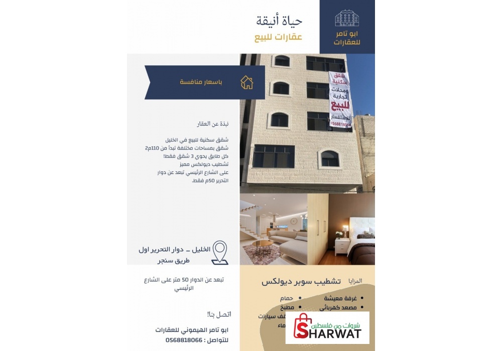 كل طابق به ثلاث شقق فقط والعمارة مكونة من ستة طبقات فقط مشطبة تشطيب كامل.