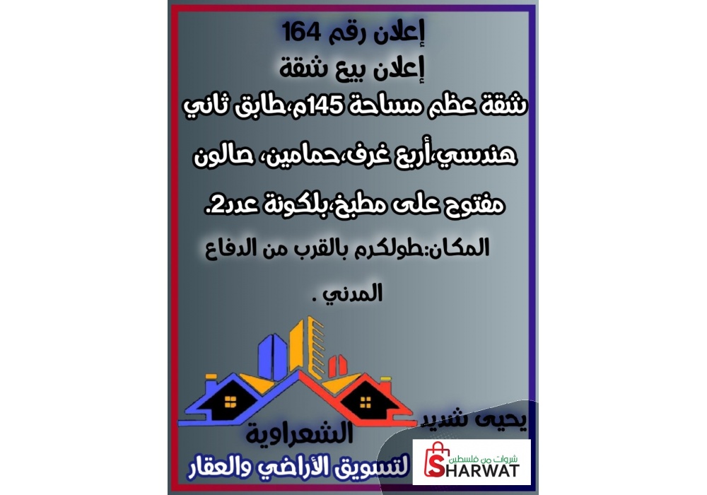 *شقة عظم مساحة 145م،طابق ثاني هندسي،أربع غرف،حمامين، صالون مفتوح على مطبخ،بلكونة عدد2.