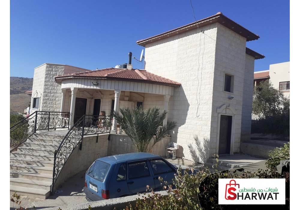 منزل مستقل حجر اربع واجهات مع ساحات وشجر مثمر وسور على محيط الارض