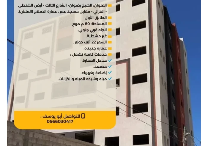شقة عظم للبيع، الطابق الأول - الشارع الثالث - أرض الشنطي - الغزالي - مقابل مسجد عمر ، عمارة الصلاح (الملش).