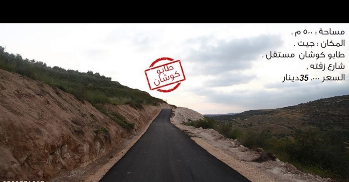 ارض 500 متر صالحة للبناء كوشان طابو تقع عند اسكانات موظفي جامعه النجاح تابعة لاراضي جيت مرتفعة ومطلة ويصلها شارع زفته كما بالصورة . السعر نهائي والتنازل مباشر مع المالك بدون اي عمولات .