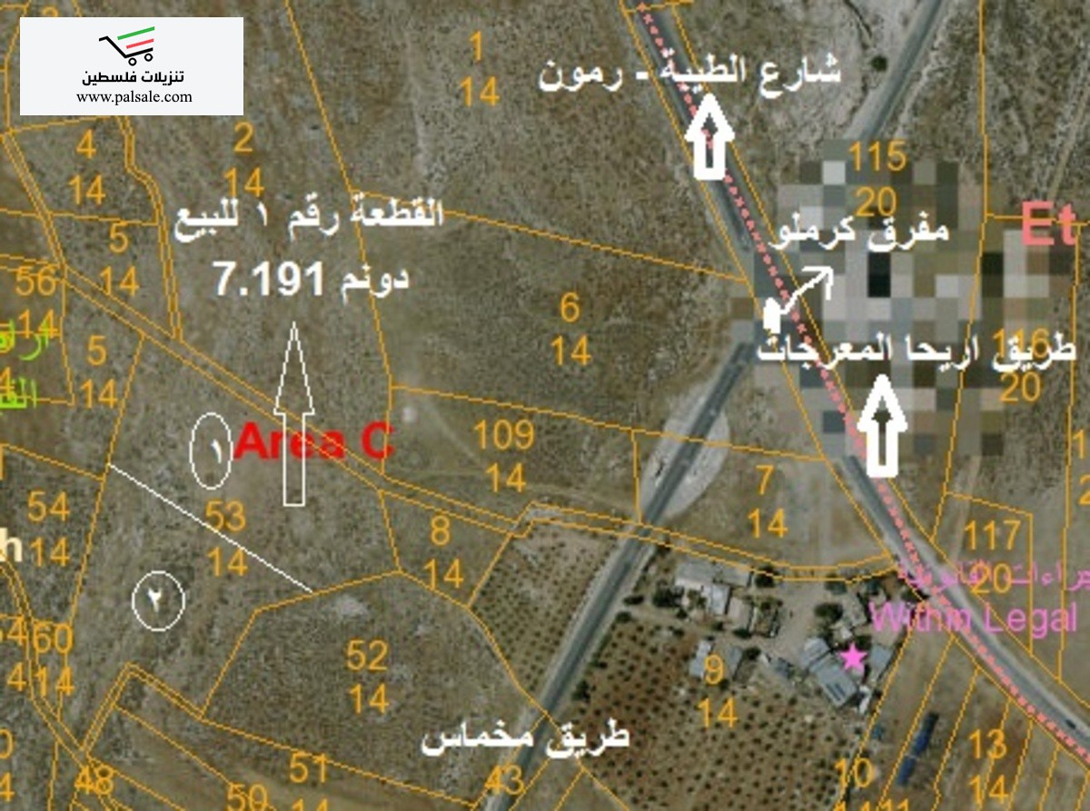 قطعة ارض 7 دونم للاستثمار من اراضي قرية رمون حوض الكري، قريبه من الشارع الرئيسي المؤدي لاريحا - المعرجات (شارع الطيبة الرئيسي) بالقرب من مفرق كرملو .