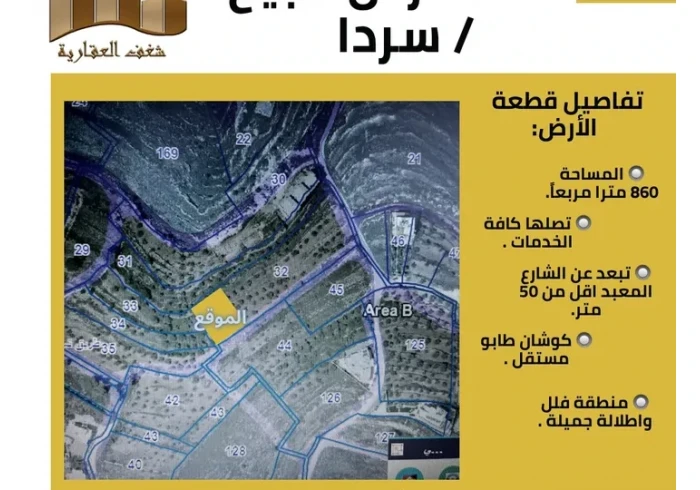 قطعة ارض 860 متر في سردا حوض الصفحة تصلح لبناء فيلا او اسكان