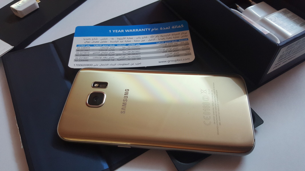 جلاكسي اس 7 لون ذهبي من افخم الالوان والذي يَملك الانحناء الحاد من الخلف الجهاز ضد الماء ومساحته 32 جيجا