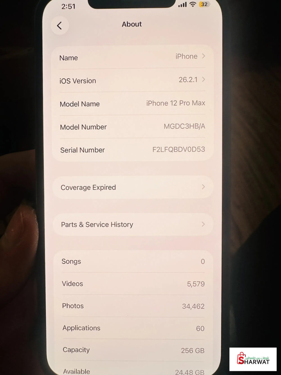 تبلغ سعة تخزين الجهاز 256 جيجابايت، وحالة البطارية الأصلية 79%.