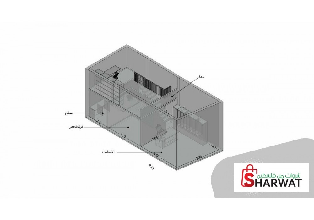محل بمساحة 60 متر مربع (40 متر ارضية و 20 متر سدة) في موقع ممتاز في بلدة عزون قضاء قلقيلية. المحل مقسم الى غرفة استقبال، غرفة فحص، مطبخ، حمام، وسدة كبيرة.