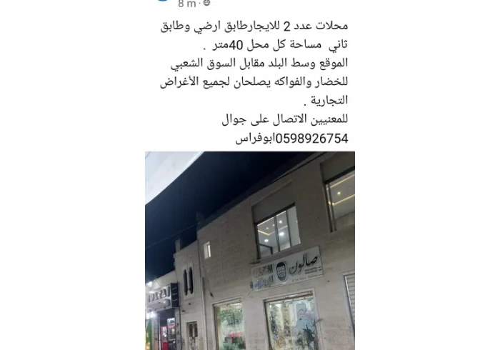 محل تجاري للايجار-الظاهرية -وسط البلد جنب المدخل الجنوبي للمسجد الكبير مقابل السوق الشعبي