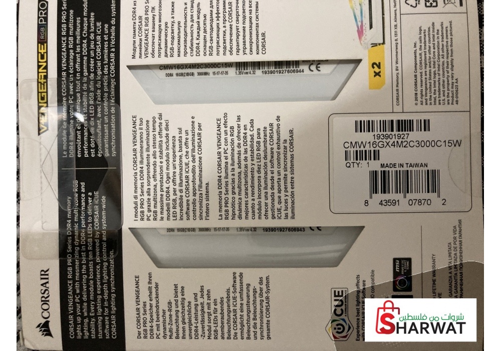 قطعتين رام 2 × 8 جيجابايت تردد 3000Mhz من شركة Corsair, جديدة غير مستعملة وبتغليفها الأصلي.