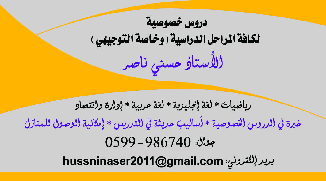 يسرُّنا أن نعلن لكم عن استعدادنا التام لإعطاء دروس خصوصية لطلاب وطالبات الثانوية العامة (التوجيهي) في مادة الرياضيات بشكل فردي أو جماعي مع استعدادنا للوصول إليكم في أماكن تواجدكم في منطقة رام الله والبيرة وبأسعار مناسبة.