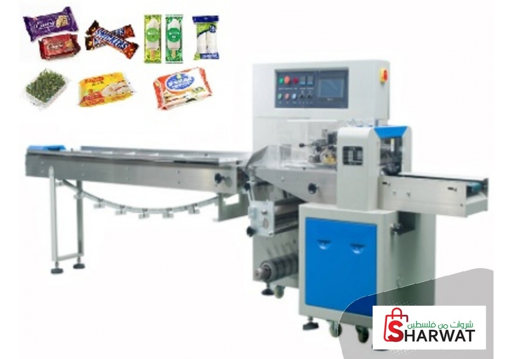 ماكنة تغليف للعاجوت والسمسمية والبسكويت والحلويات وخلافة بسرعة عالية ودقة عالية ونسبة خطا معدومة تعمل بنظام محركات السيرفو وحساسات ضبط جودة