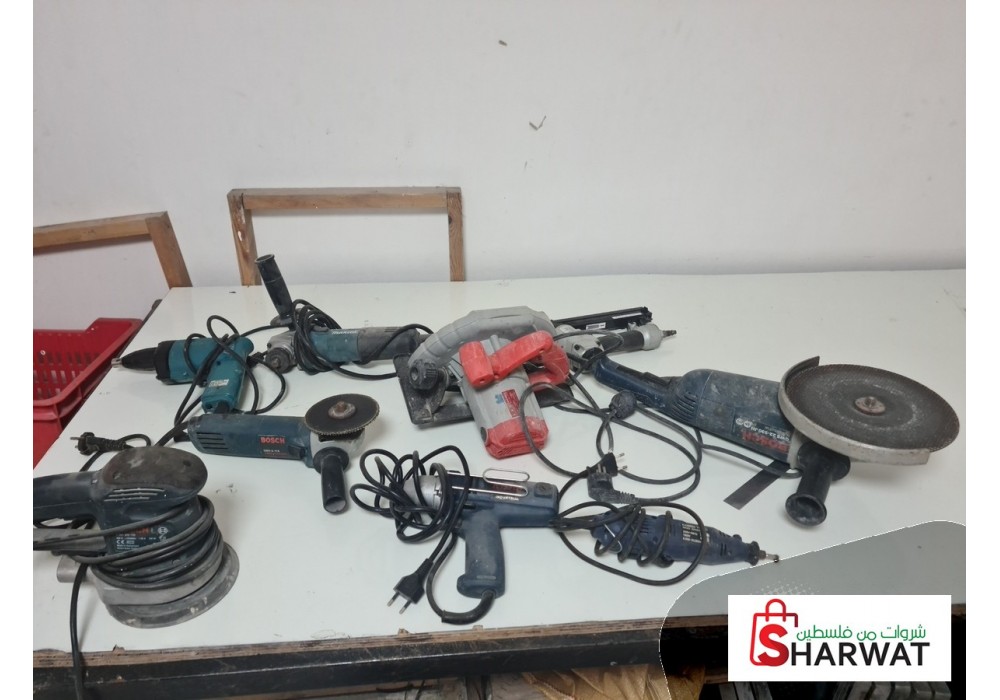 عدة استعمال شخصي منزلي جميعها اصليه من بوش مكيتا ديولت كلها شغاله ميه ميه وضعها ممتاز ويوجد دسك قص حديد ثابت وماكينة حف مستطيله وماكينة لحام حديد نوع همر صغير
