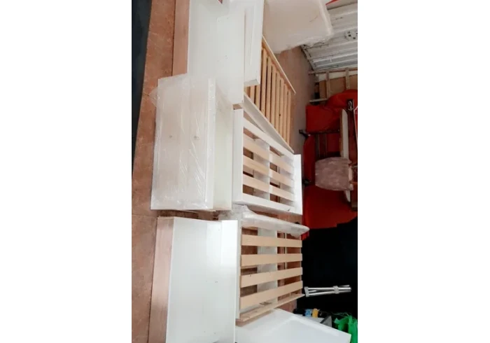 سرير مزدوج طابقين فوق بعض مع فرشاتهم..خشب طبيعي ساندويش اول باب ..لون السريرين أبيض ..ميتعملات شبه جداد ..سعر التكلفة وهم جداد