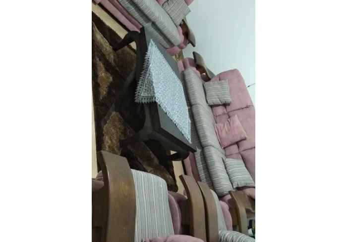 كنب قعدة للضيوف مستعمل شيء بسيط لون زهري مكون من سبع مقاعد مع سجادة بنية اللون
