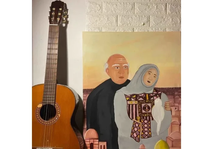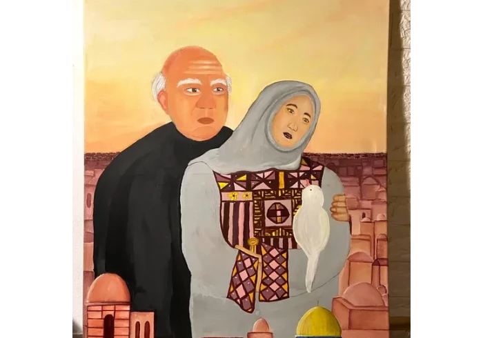 توحي الرسمه عن امرأة فلسطينيه متعلقه بصورة فلسطين قديما ، صورة مباني فلسطين وهي مستقله ، خاليه من الاحتلال يعم بها السلام ,امرأة صابره بدعم والدها الشهيد الراحل الذي دائما كان سندها ،ومصدر صبرها ،ومصدر الهامها ،فهي رغم كل الشتات الذي يحدث بفلسطين ،ما زالت متعلقه بصورة فلسطين قديما ،ما زال لديها امل بعودة السلام ،ما زالت تنظر بعين الحمام وتحمل مفتاح العودة..