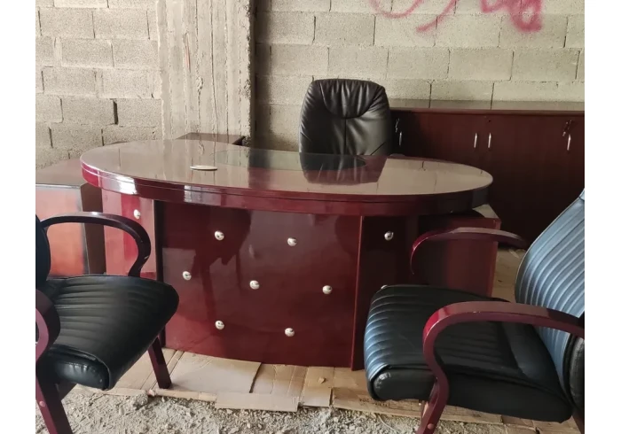 يشمل مكتب قياس 160*80 ومساعد جانبي 120*40 و وحدة حوارير وخزانة ملفات بوضع الجديد تماماً وكرسي مدير جلد وكراسي انتظار جلد