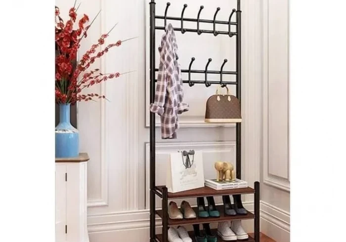 علاقة ملابس مع رفوف تحتوي على مكان لتعليق الملابس ?