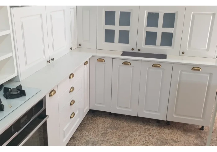 الكلاسيكية مات اللمعان الأبيض خزانة مطبخ من لوح الألياف متوسط الكثافة مع خزائن بالحائط باب زجاجي،،