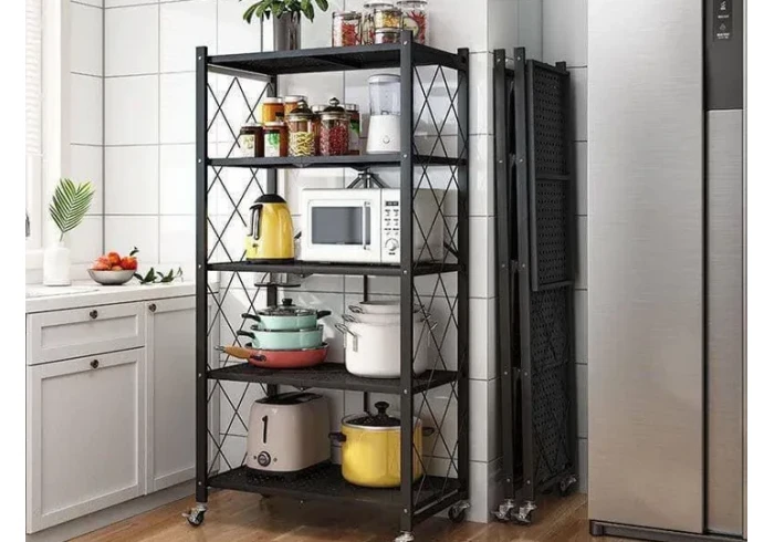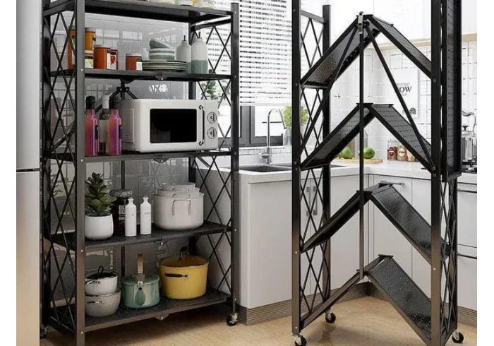 رف مطبخ حديد تقيل قابل للطي باللون الاسود المميز مع عجلات لعدة استخدامات