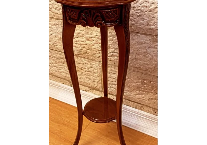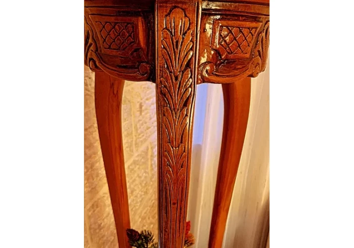 طاولة طراز فرنسي من القرن التاسع عشر ثلاثية القوائم مصنوعة من خشب الجوز،تمتاز بحفر يدوي على جوانب الطاولة وقوائمها الثلاثة، وسطح من الرخام متعدد الألوان، قاعدة خشبية ملساء، متينة جداً، متعددة الاستعمالات بحيث يمكن استعمالها كقطعة ديكور منفردة او بإضافة بعض الاكسسوارات اليها