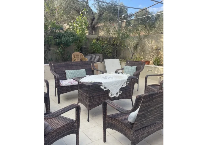 طقم جلوس خارجي مصنوع من القش الفاخر لونه بني مكون من 8 مقاعد بالاضافة الى طاولة و 8 مساند طبية.