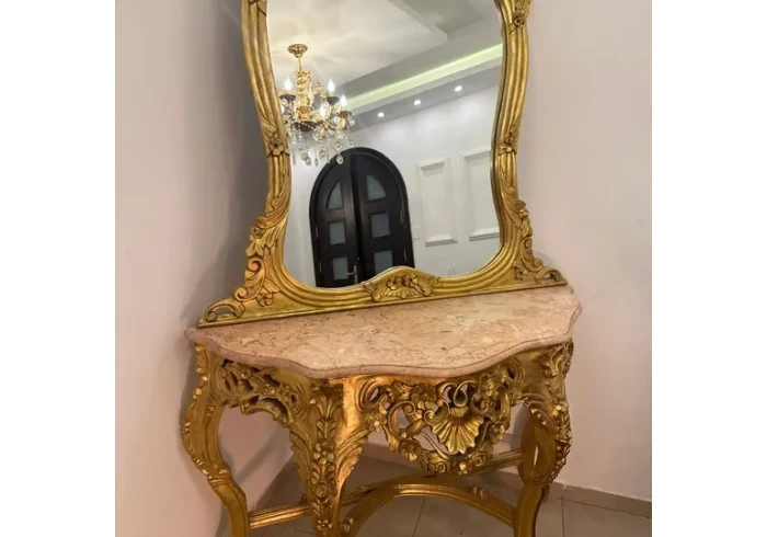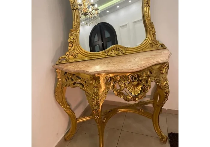 عباره عن مرآه خشب حفر ذهبي وطاوله رخام وخشب حفر دهبي خشب زان