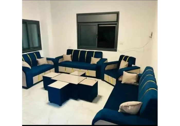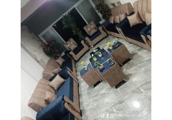 طقم صالون تفصيل خشب ابيض سويد قماش وتر بروف إسفنج ضغط 33 9 مقاعد +طاولة وأربع سكملات + قرن للكنب