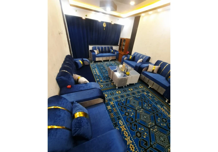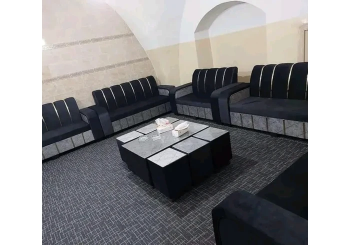 طقم صالون تفصيل خشب سويد أبيض إسفنج ضغط 33 قماش وتر بروف أصلي 9 مقاعد + طاولة + 4 سكملات + قرن