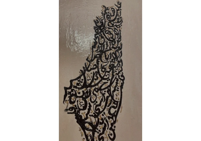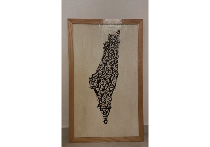 اللوحة عبارة عن خارطة فلسطين يتخللها ابيات من قصيدة الشاعر محمود درويش بالخط العربي ( على هذه الارض ما يستحق الحياة )