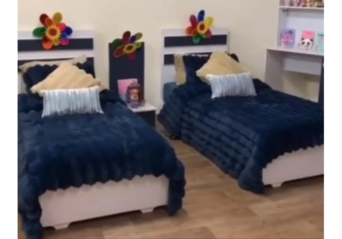 تخت عدد (2) مفرد للبيع جديد ولم يناسبوا حجم الغرفة. اللون( ابيض مع ديكور باللون الكحلي)، لم يتم استخدامهم.