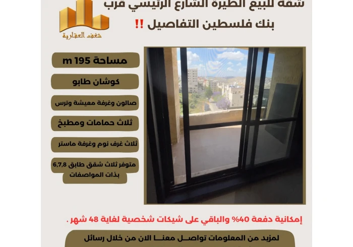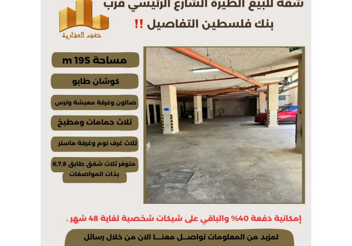 تملك شقة مميزة في افضل مناطق #الطيرة الشارع الرئيسي قرب بنك فلسطين ، امكانية دفعة اولى 40% والباقي شيكات شخصية لغاية 48 شهر .