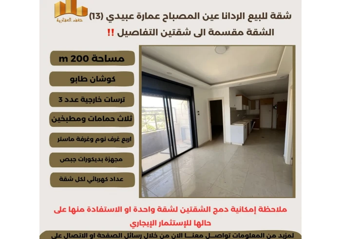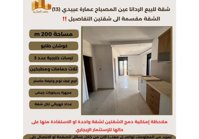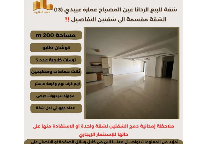 تملك شقة مميزة في #الردانا منطقة عين المصباح ، في مشروع عبيدي 13 ، الشقة مقسمة الى شقتين تصلح للدمج او الاستثمار الايجاري .