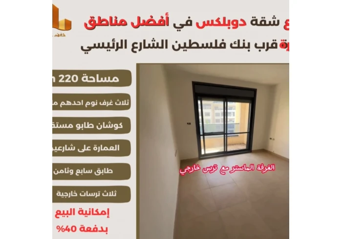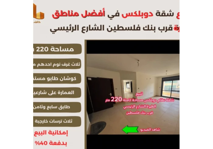 تملك #شقة #دوبلكس مميزة مساحة 220m في افضل مناطق #الطيرة الشارع الرئيسي قرب بنك فلسطين ، امكانية دفعة اولى 40% والباقي شيكات شخصية لغاية 40 شهر .