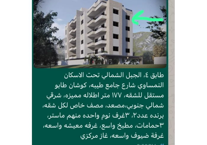 شقة عظم للبيع بمنطقه الجبل الشمالي بجانب الاسكان النمساوي..طابق رابع اطالاله خلابه على المدينه… كوشان طابو مستقل بالشقه ،،، مصف سيارات خاص،،،، مصعد،،، غاز مركزي ،،،،،المساحة 177
