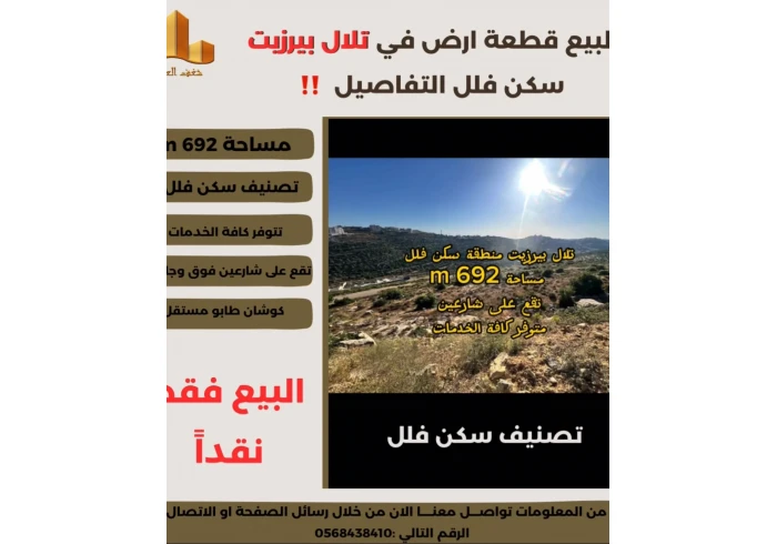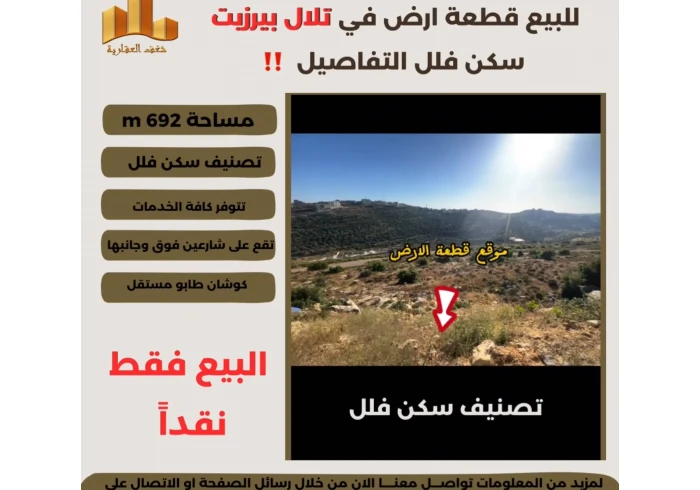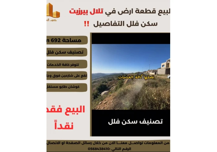 تملك في #تلال_بيرزيت قطعة ارض سكن فلل 692 متر ذات موقع مميز وإطلالة غربية رائعة جداً تتوفر كافة الخدمات تصلح لبناء فيلا وتحظى بمستقبل استثماري مميز