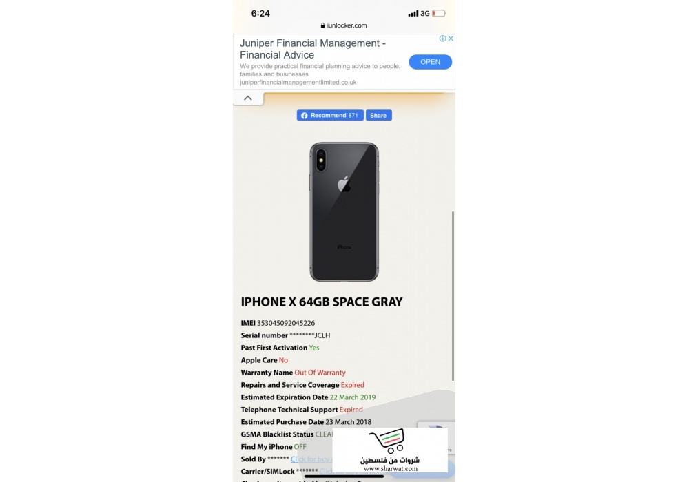 ايفون اكس اسود / الذاكرة 64 جيجا /صحة البطارية 86% / الجهاز شبه جديد/ السعر 1599 شيكل.